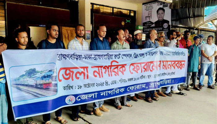 ব্রাহ্মণবাড়িয়া রেলওয়ে স্টেশনে অতিরিক্ত যাত্রী চাপ কমাতে ব্রাহ্মণবাড়িয়া-ঢাকা রুটে স্পেশাল ট্রেন চালু ও বিজয় এক্সপ্রেস ট্রেনের যাত্রাবিরতির দাবিতে মানববন্ধন করেছে জেলা নাগরিক ফোরামের নেতারা। শনিবার (১৮ অক্টোবর) সকালে স্টেশন প্রাঙ্গণে এ মানববন্ধন অনুষ্ঠিত হয়।